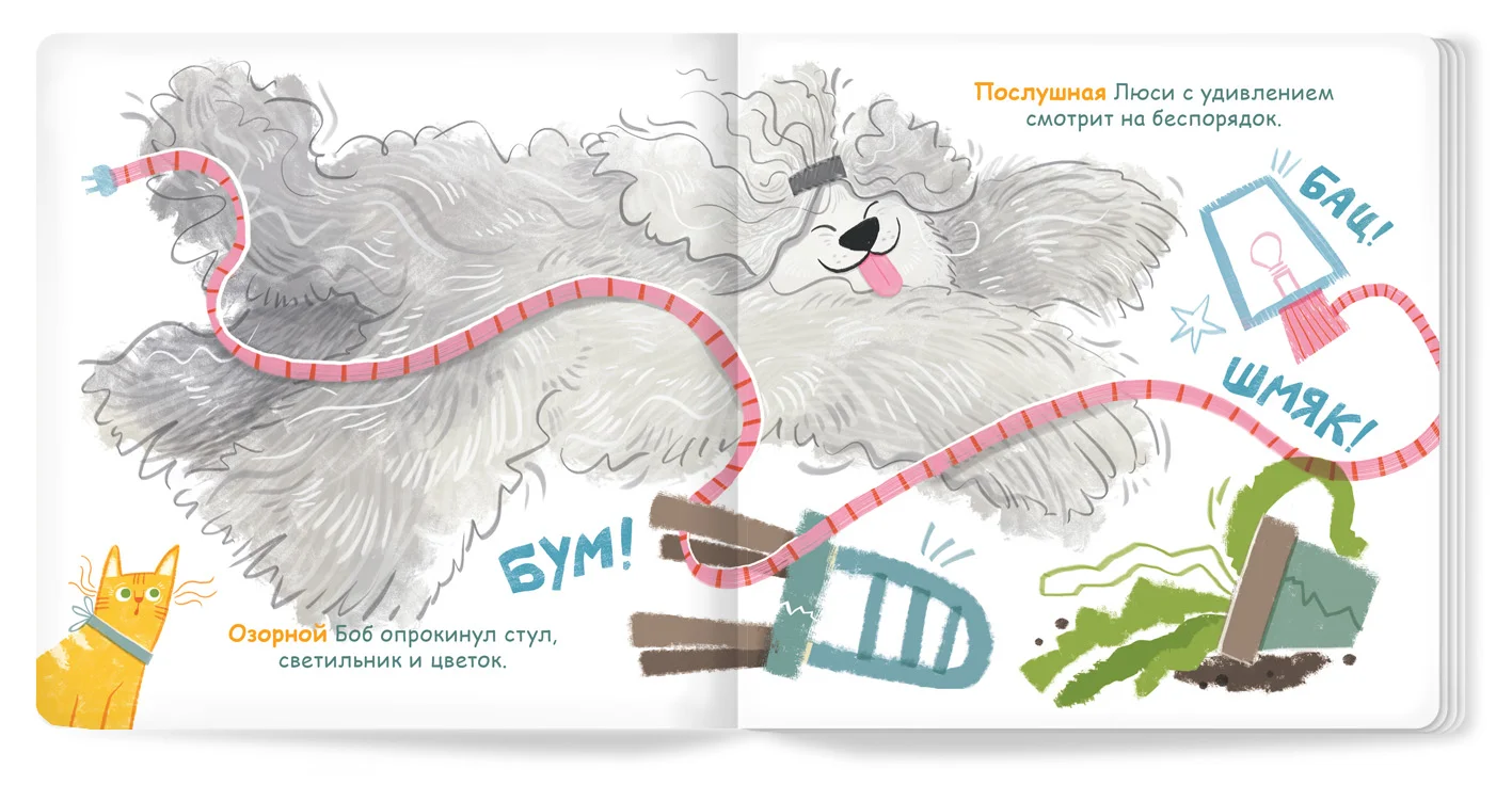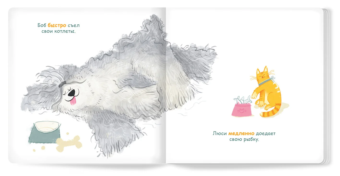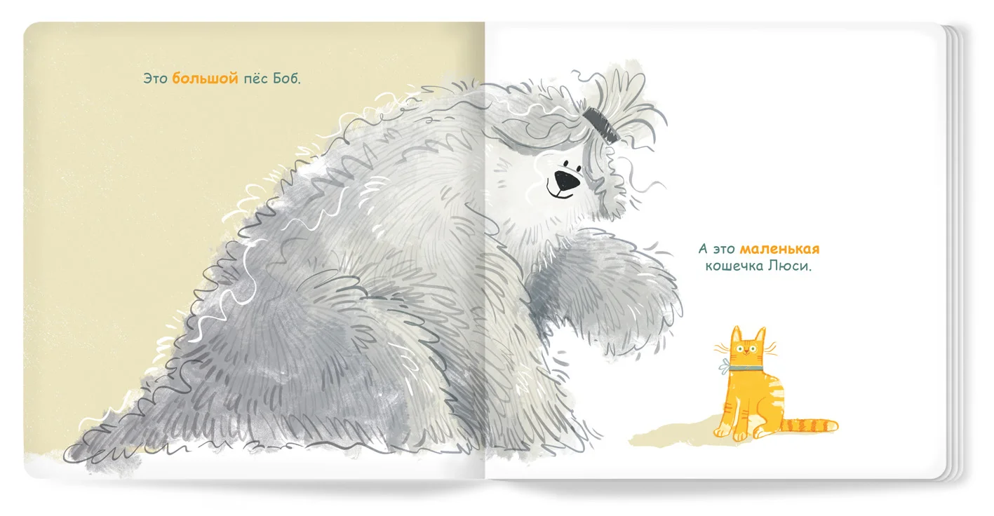 Большой пёс Боб и маленькая кошечка Люси живут в одном доме. Озорной Боб обожает есть котлеты и резвиться под дождём. Послушная Люси любит быть дома и лакомиться рыбкой…