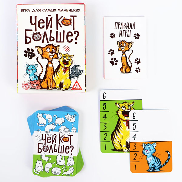 Для самых маленьких Проводить занятия с детьми лучше в игровой форме: так материал быстрее и лучше усваивается. Карточки «Чей кот больше?» помогут малышам повторить цифры до 6 и научиться различать размеры предметов. Считаем и сравниваем числа Участникам предстоит определять и сопоставлять между собой размеры забавных котиков. Игрок, чей зверёк больше, забирает карточки у других. Побеждает тот, у кого к концу будут все карточки!