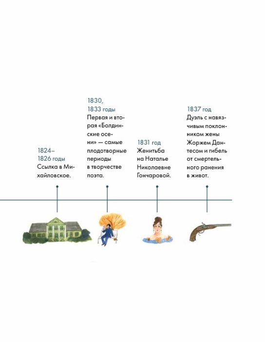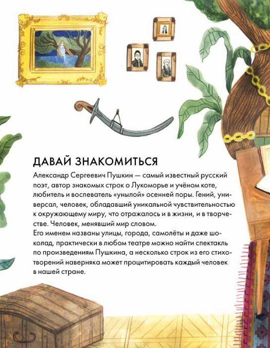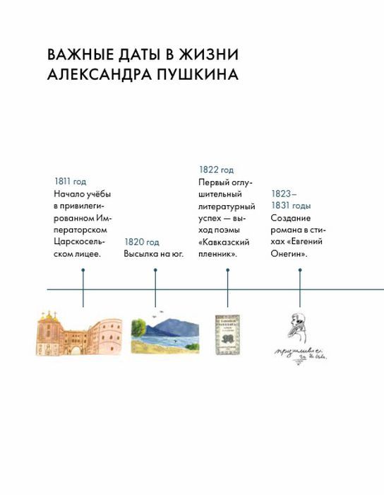Александр Сергеевич Пушкин — самый известный русский поэт. Многие поколения детей росли и растут на его сказках, романы и лирику Пушкина изучают в школах, по произведениям ставятся спектакли и снимаются фильмы, и, наверное, практически каждый человек в нашей стране может процитировать его стихотворения. И конечно, всем известны факты из биографии Александра Сергеевича: он учился в Лицее, был дружен с декабристами, неоднократно отправлялся в ссылки и погиб на дуэли. Но не так много мы знаем о том, каким же человеком был великий поэт. Эта краткая иллюстрированная биография расскажет о жизни Александра Сергеевича Пушкина. Кем он работал после окончания Лицея? Как ему удалось сделать писательство настоящей профессией? Почему Пушкин охотно делился идеями произведений, хотя сам зарабатывал литературным трудом? А ещё о том, почему важно оттачивать свои таланты, даже будучи признанным гением, ценить дружбу и оставаться верным своим идеалам.