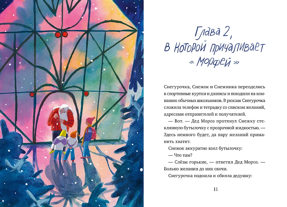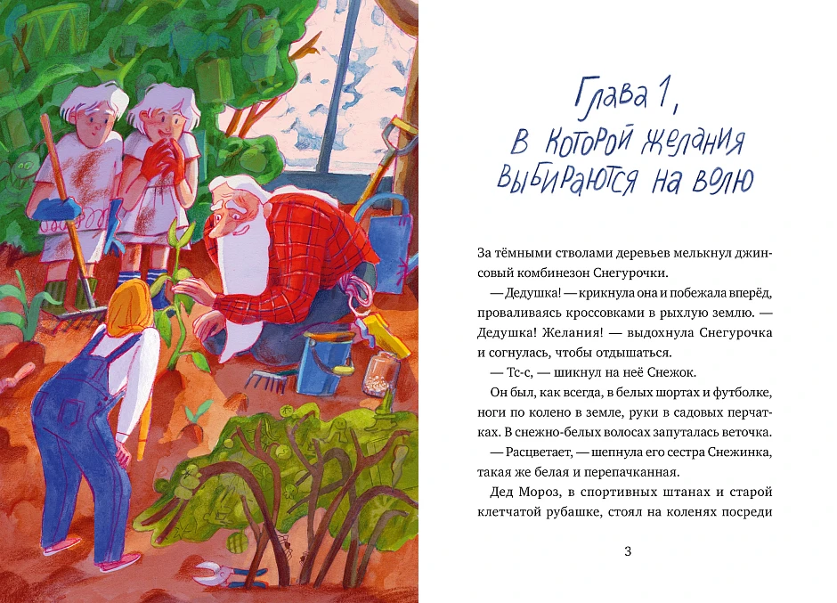 “Дед Мороз, в спортивных штанах и старой клетчатой рубашке, стоял на коленях посреди грядки. Вокруг уже вовсю плодоносили деревья желаний: на могучих ветках дозревали наборы лего и плюшевые единороги, кусты прогибались под тяжестью книжек и новеньких смартфонов. Но в этот момент внимание всех оказалось приковано к невзрачному тоненькому стеблю.”