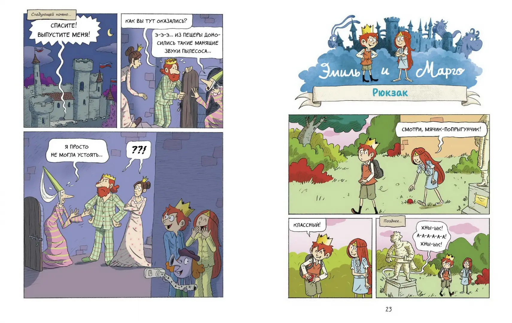 Вот принц и принцесса на глазах у оторопевшей гувернантки крадутся ночью из замка, следуя за манящим звуком флейты. Или ищут пропавший рюкзак возле фонтана, которого никогда не было. А куда их приведет этот странный туннель из подвала?