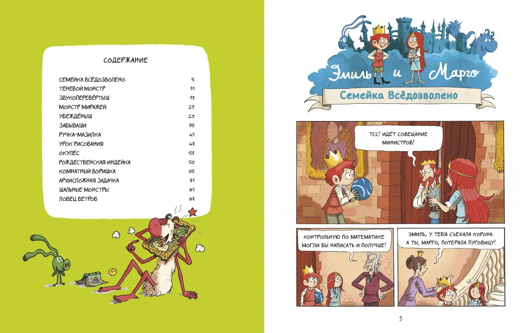 Кто превратил фонтан в гигантское мороженое? Кто надел на статую носок? Кто заставил птиц мяукать, а кошек чирикать? Конечно же, монстры. Они всегда готовы устроить кавардак в замке… На радость Эмилю и Марго! Читайте всей семьей и хихикайте над новыми приключениями озорных принца и принцессы.