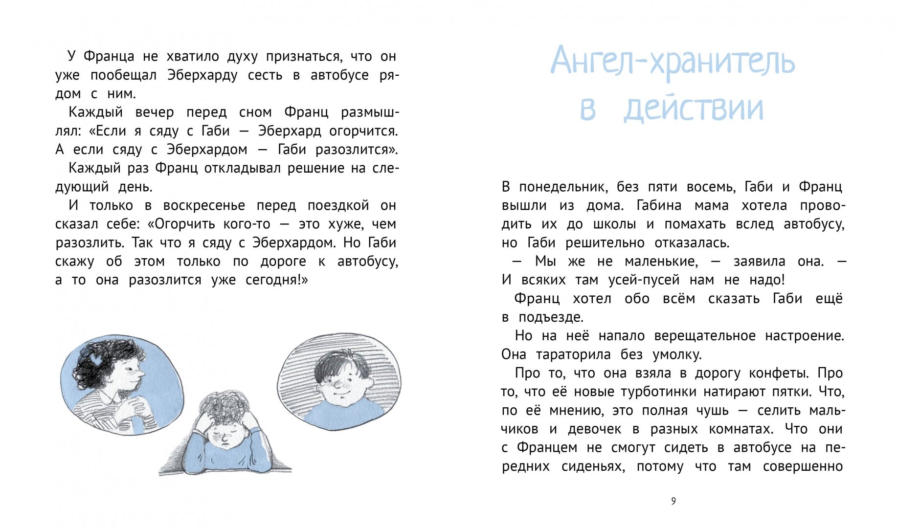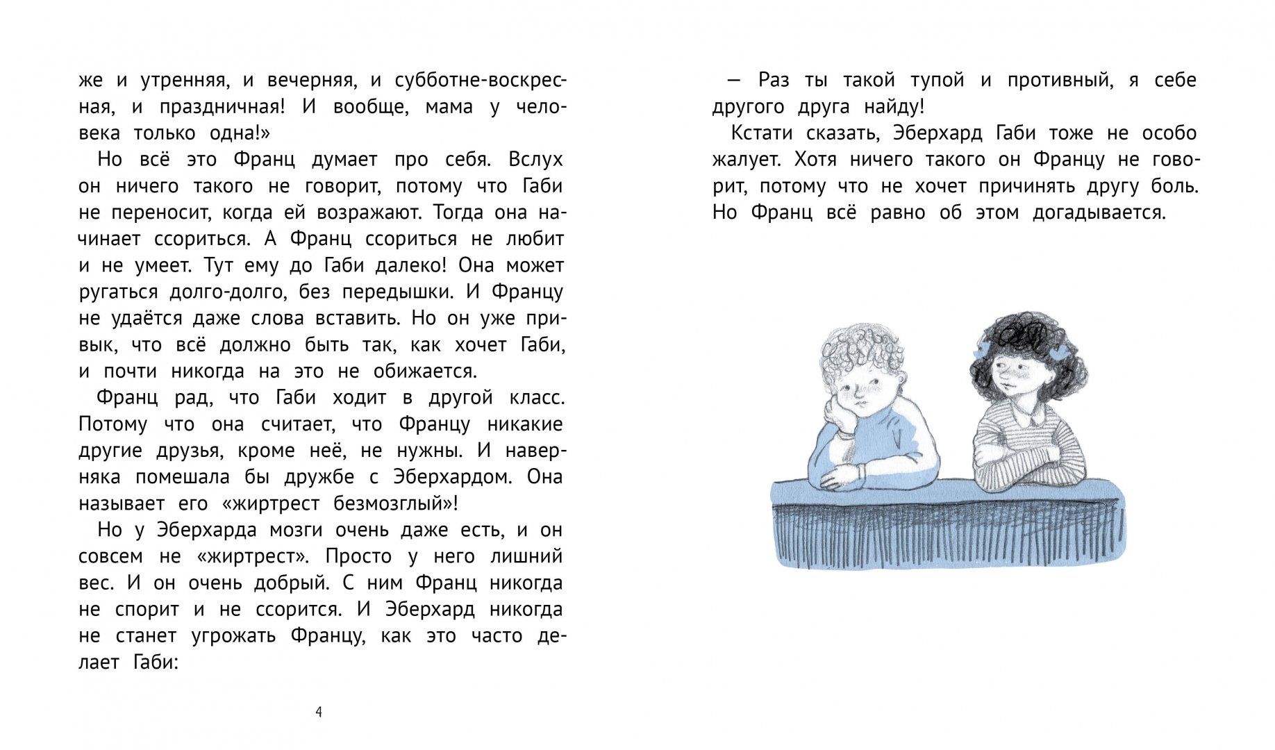 У мальчика есть двое друзей – Эберхард и Габи. Франц и Эберхард – одноклассники, они общаются в школе, а у взбалмошной и очень обидчивой Габи герой каждый день бывает после уроков – они живут в соседних квартирах. Но надо же было такому случиться, что Франц пообещал сесть в экскурсионном автобусе с Эберхардом, а тут и Габи уверенно заявила, что в пути будет сидеть с Францем! Как тут радоваться предстоящей поездке, если ссорой запахло ещё до её начала? Из самой безвыходной ситуации герой Кристине Нёстлингер всегда находит выход, пусть и неожиданный, пусть и с непредсказуемыми последствиями. Вот и на этот раз его школьный друг и “послешкольная” подруга не то что не разругались – а вызвали у Франца ревность.