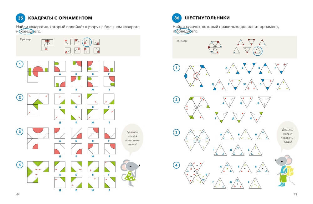 Аналогии, последовательности, орнаменты, геометрические фигуры, счетные палочки, домино, ребусы, кубики, шифры, графические примеры — все задания в сборнике не требуют вычислений. Выполнять их можно в любом порядке, выбирая те, которые больше всего нравятся.