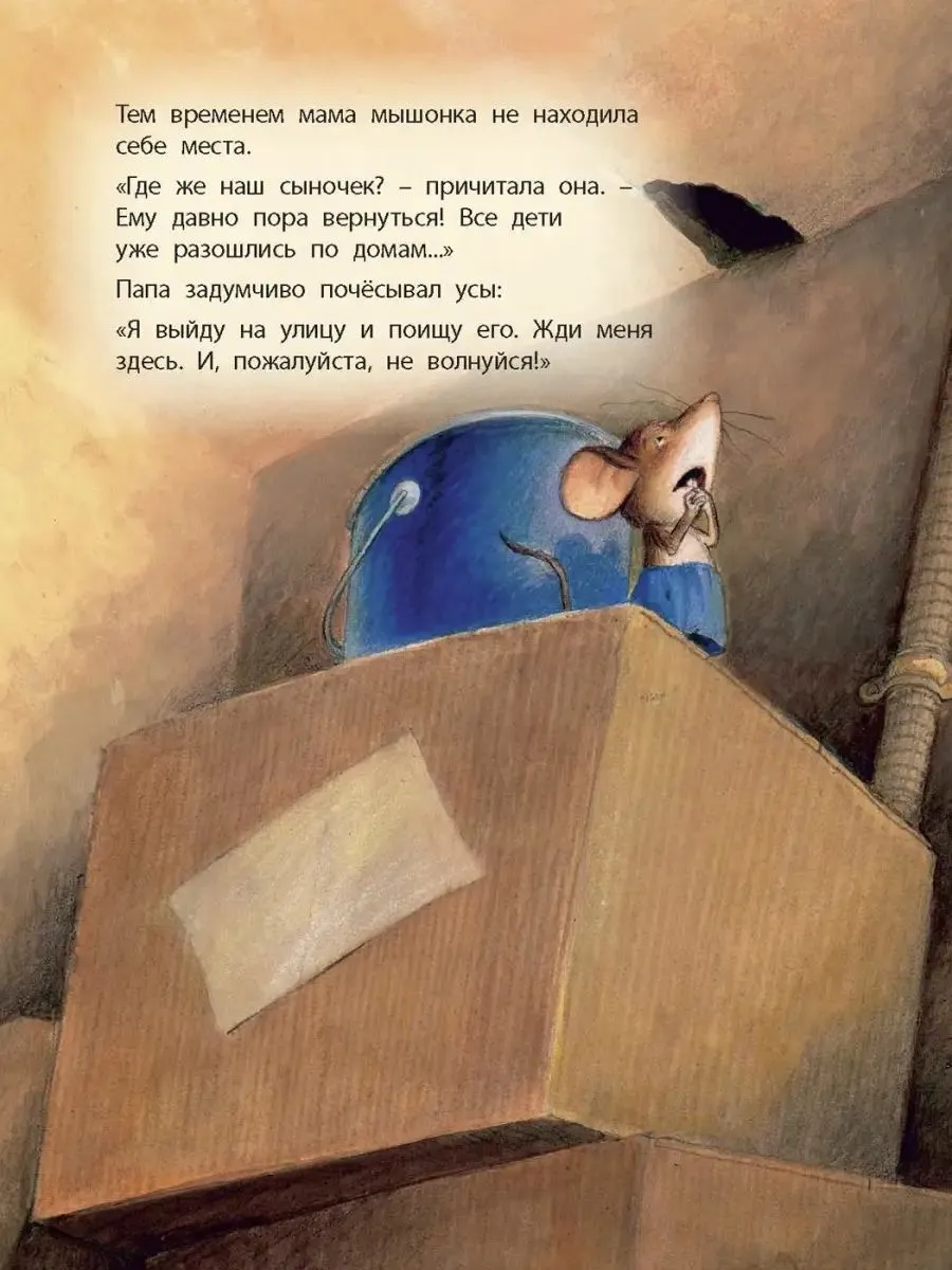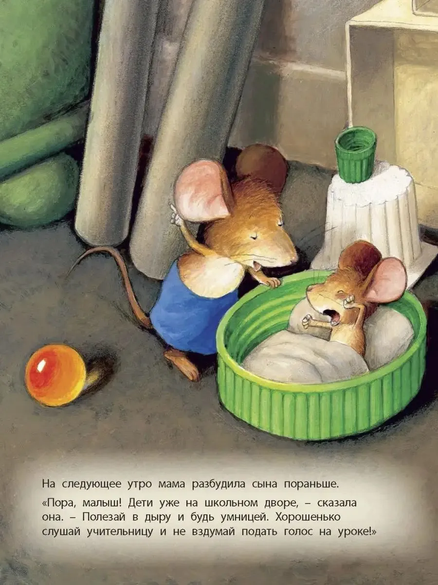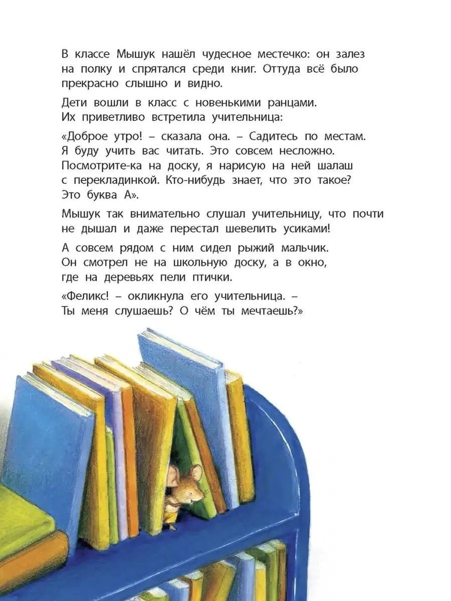 Трогательная и прекрасно иллюстрированная история о любви к знаниям. Во время каникул в опустевшей школе поселилась мышиная семья. А когда уроки возобновились, маленький мышонок тоже решил научиться читать. Он тайком пробирался в класс и вместе с первоклассниками старательно изучал буквы. Малыш решил когда-нибудь написать книгу. Тогда папа и мама мышонка тоже решили освоить грамоту…