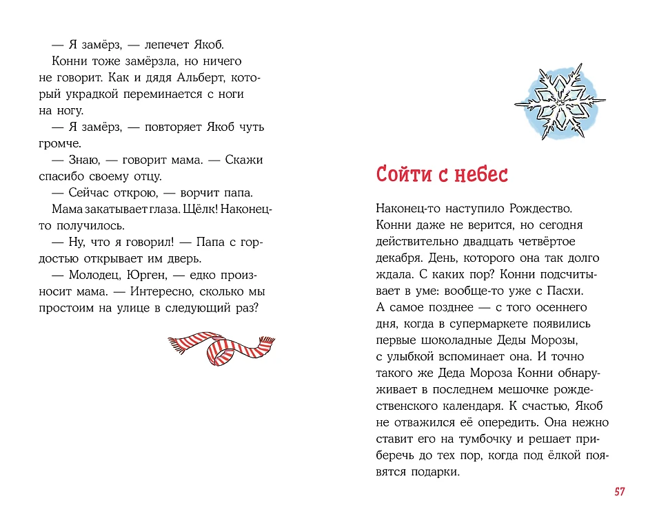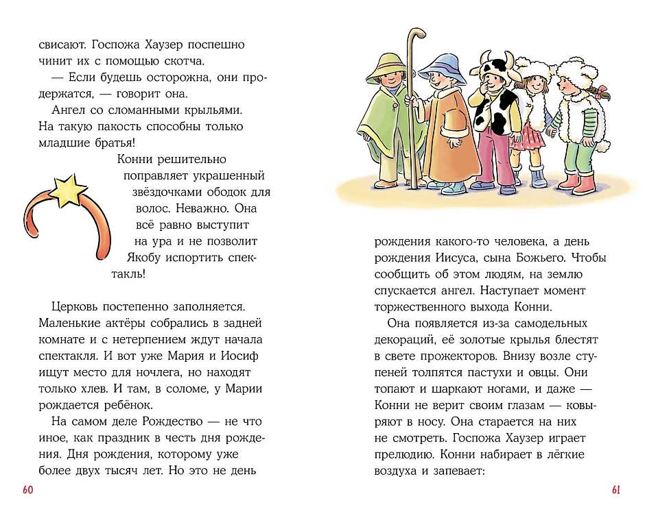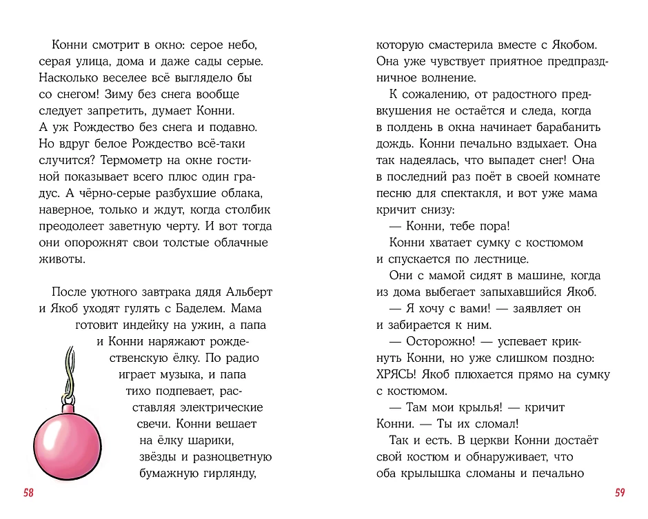 Рождество — волшебный праздник: мама вешает на стену рождественский календарь, под ёлкой появляются подарки, вся семья собирается за праздничным столом… Вот только в этот раз всё пошло наперекосяк: родители поругались, Якоб доводит сестру до белого каления своими капризами, а самой Конни придётся участвовать в рождественском спектакле, хотя там одни первоклашки, а ей уже девять! Удастся ли героине справиться со всеми неприятностями и состоится ли праздник, которого она так долго ждала?