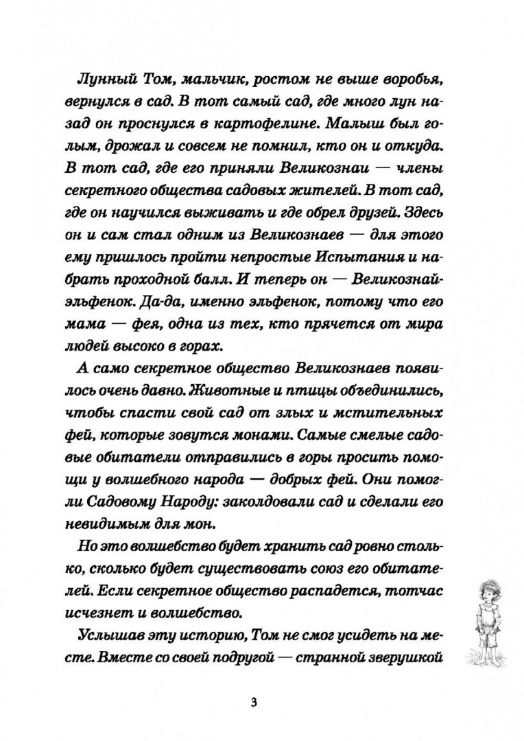 Лунный Том вернулся из страны Альба Лонга в любимый сад, где его нашли когда-то лежащим в картофелине Великознаи – ёж Фырфыль, мышка Мистигриза, червяк Бербяк и другие. Но в секретном обществе Великознаев, куда вступил и сам Лунный Том, – раскол: лесной грызун Паоло исчез. А ведь сад безопасен лишь до тех пор, пока среди населяющих его зверей процветают дружба и взаимопонимание! Иначе – злобные моны постараются уничтожить обитателей сада. Настало время малышу Тому помочь тем, кто однажды спас его!