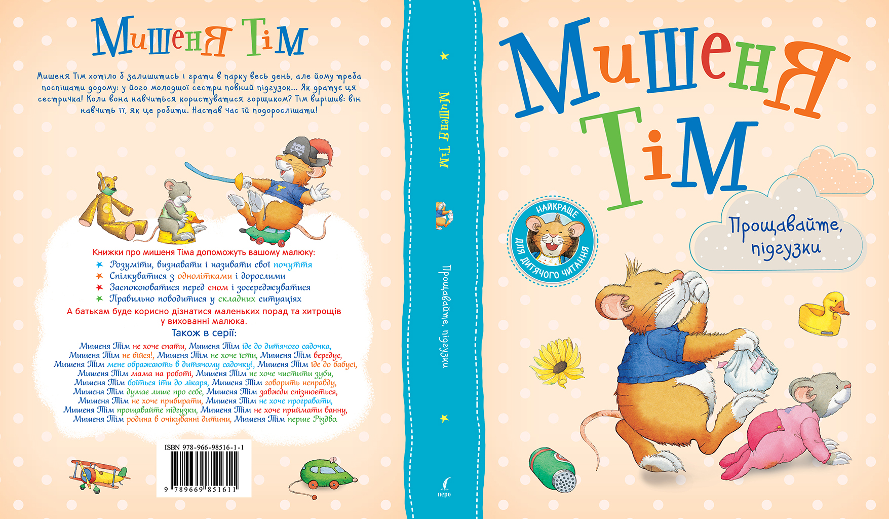 Книжка «Мишеня Тім Прощавайте підгузки» — одна з серії книг про кумедного і милого мишенятка Тіма допоможе малюкам розуміти, визнавати й називати свої почуття, навчитися спілкуватися з однолітками і виходити зі складних ситуацій.