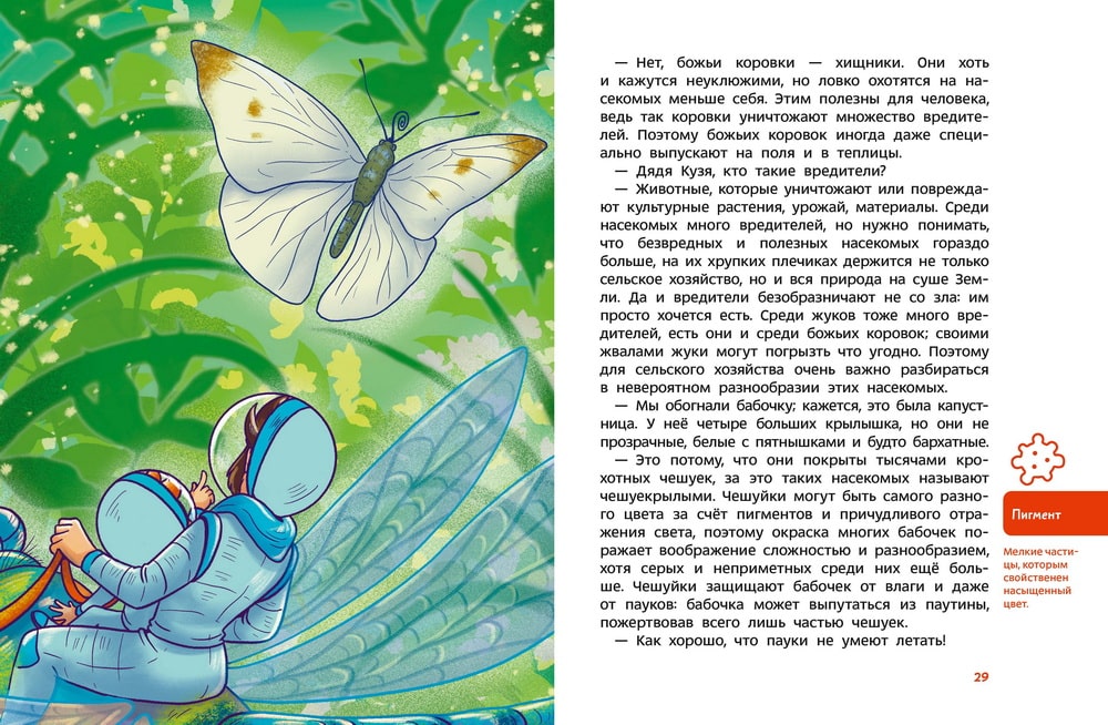 Ребята узнают, почему детство цикады длится целых 17 лет, для чего гусеницам учить «язык» муравьев и какой паук притворяется цветком. А еще — как один муравейник защищает лес размером с футбольное поле. И почему без насекомых в мире не было бы многих любимых вещей — от шелка до медовых пряников.