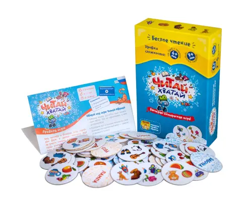 В игровом комплекте 96 фишек-жетонов. С одной стороны фишки – три ярких картинки, с другой написано слово. Фишки разделены цветом на два игровых комплекта: в первом, оранжевом, слова покороче, в синем – подлиннее. Есть три варианта правил: в самом простом читать не нужно – игроки наперегонки находят одинаковые картинки…