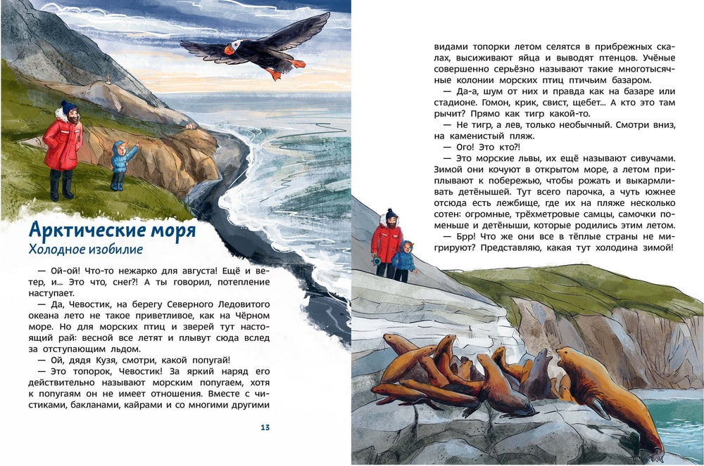 В новой энциклопедии Чевостик и дядя Кузя найдут ответы на эти и многие другие вопросы и отправятся в путешествие по морям и океанам Земли. Они побывают во всех климатических зонах и увидят всё разнообразие морского мира. Удивительные животные, растения, которые трудно себе представить, таинственные обитатели океанических глубин, морские гиганты, которые кажутся ожившими персонажами легенд, ждут наших героев.