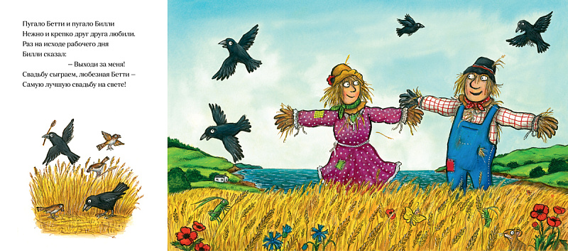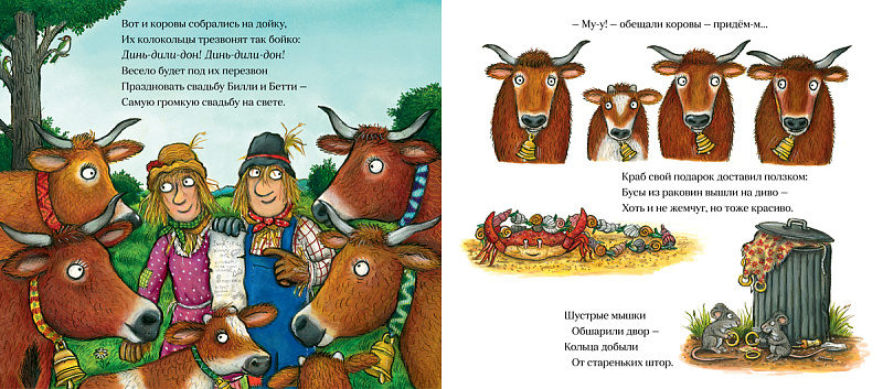 …”Согласна! Ура!” – сказала Бетти, и молодые принялись за приготовления. Портной паучок сшил пышное платье из белых как снег гусиных перьев. Коровы одолжили свои колокольца – чтобы весело трезвонить на свадьбе. Краб нанизал бусы из пестрых раковин. Шустрые мышки обшарили двор – добыли кольца от стареньких штор. Осталось нарвать большущий букет, и Билли отправился за ним.