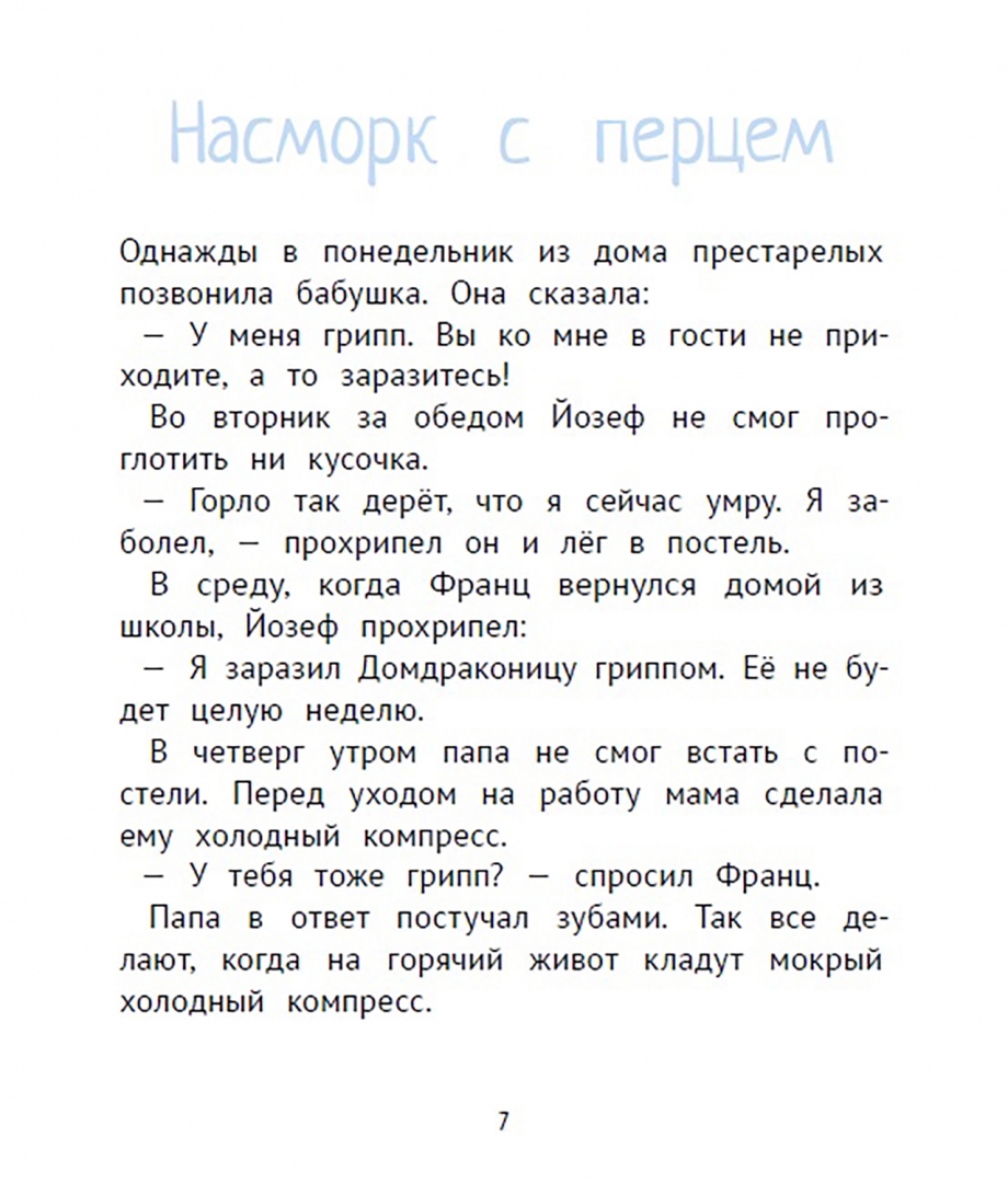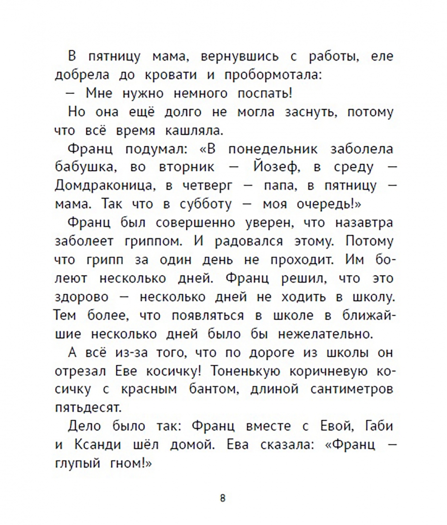 Первая – это фрау Ляйденфрост, или Домдраконица, как называет её Йозеф. Она приходит домой к Францу, чтобы убраться и приготовить обед. Фрау Ляйденфрост вечно на всех рычит, поэтому Франц её недолюбливает. Вторая проблема – это болезни. Франц изо всех сил пытается чем-нибудь заболеть, чтобы не ходить в школу, но у него никак не получается. Он считает, что это ужасно несправедливо. Только вот Франц ещё не знает, каково это – болеть по-настоящему… Почему нельзя есть слишком много клубники? Что делать, если сломал ногу, а мамы нет рядом? Как превратить болезнь в конфетный пир? Об этом и о многом другом – в новой книге рассказов про Франца.