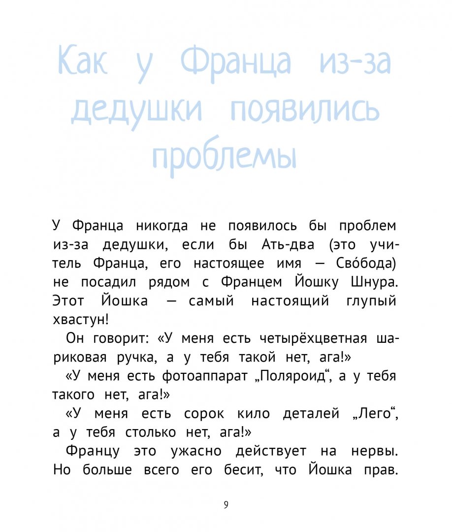 В этой книге классика австрийской детской литературы Кристине Нёстлингер вас ждёт новая порция рассказов о главном герое, которому уже совсем скоро девять лет. Франц учится во втором классе, и всё у него замечательно, кроме одного: мальчик по имени Йошка всё время Франца обижает. Йошка – ужасный хвастун. Он дразнит Франца, что у того нет четырёхцветной ручки, конструктора, фотоаппарата или ещё чего-нибудь, что есть у него самого. Как-то раз Йошка вообще поступил очень некрасиво: зная, что у Франца нет дедушки, взял и похвастался своим. Франц не выдержал и ответил, что у него тоже дедушка есть. Но Йошка ему не поверил. Ребята бросились Франца защищать и даже поспорили, что он не соврал и скоро покажет всем дедушку. Ну и что теперь Францу делать? Где ему найти настоящего деда? Похоже, Франца может спасти только один человек – его любимая бабушка…