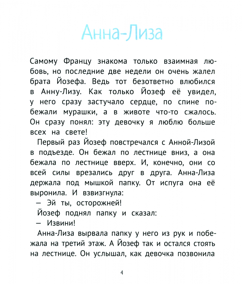 В этой книге классика австрийской детской литературы Кристине Нёстлингер вас ждёт новая порция рассказов про Франца. Францу восемь с половиной лет, и пока ему знакома только взаимная любовь: Франц любит папу, маму, бабушку и брата Йозефа, а те, конечно же, любят его. Но вот Йозеф безответно влюбляется в девочку, с которой едва знаком. Франц за Йозефа очень переживает и решает помочь брату завоевать её сердце. Но стоит ли вмешиваться в чужие отношения? Особенно когда толком не понимаешь, что творится в голове у мальчиков и девочек тринадцати лет. Да и к чему вмешиваться, если у самого дружба расклеилась? Габи, лучшая подружка Франца, теперь души не чает в Сандре, а его почти не замечает. Но если бы только это… Франц ведь и сам влюбился, да ещё в самую большую хулиганку. Как же со всем этим быть?