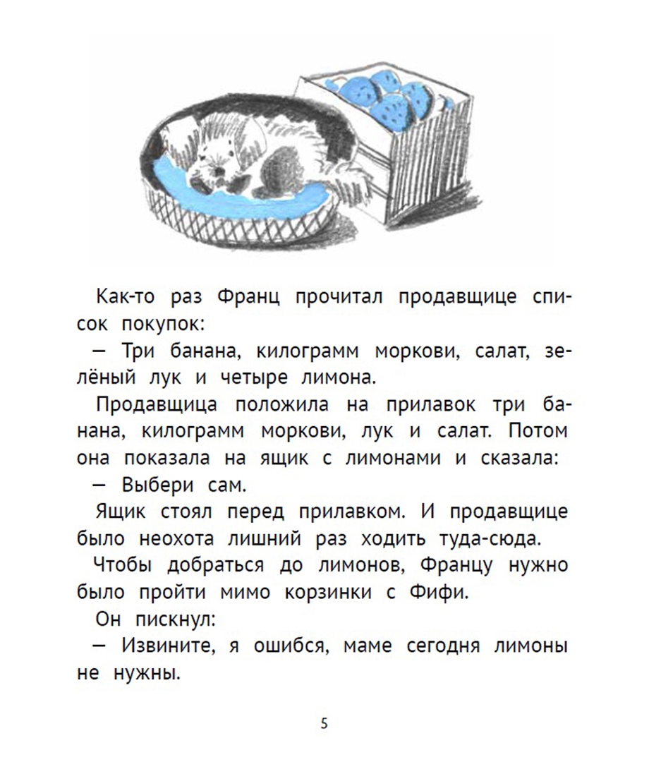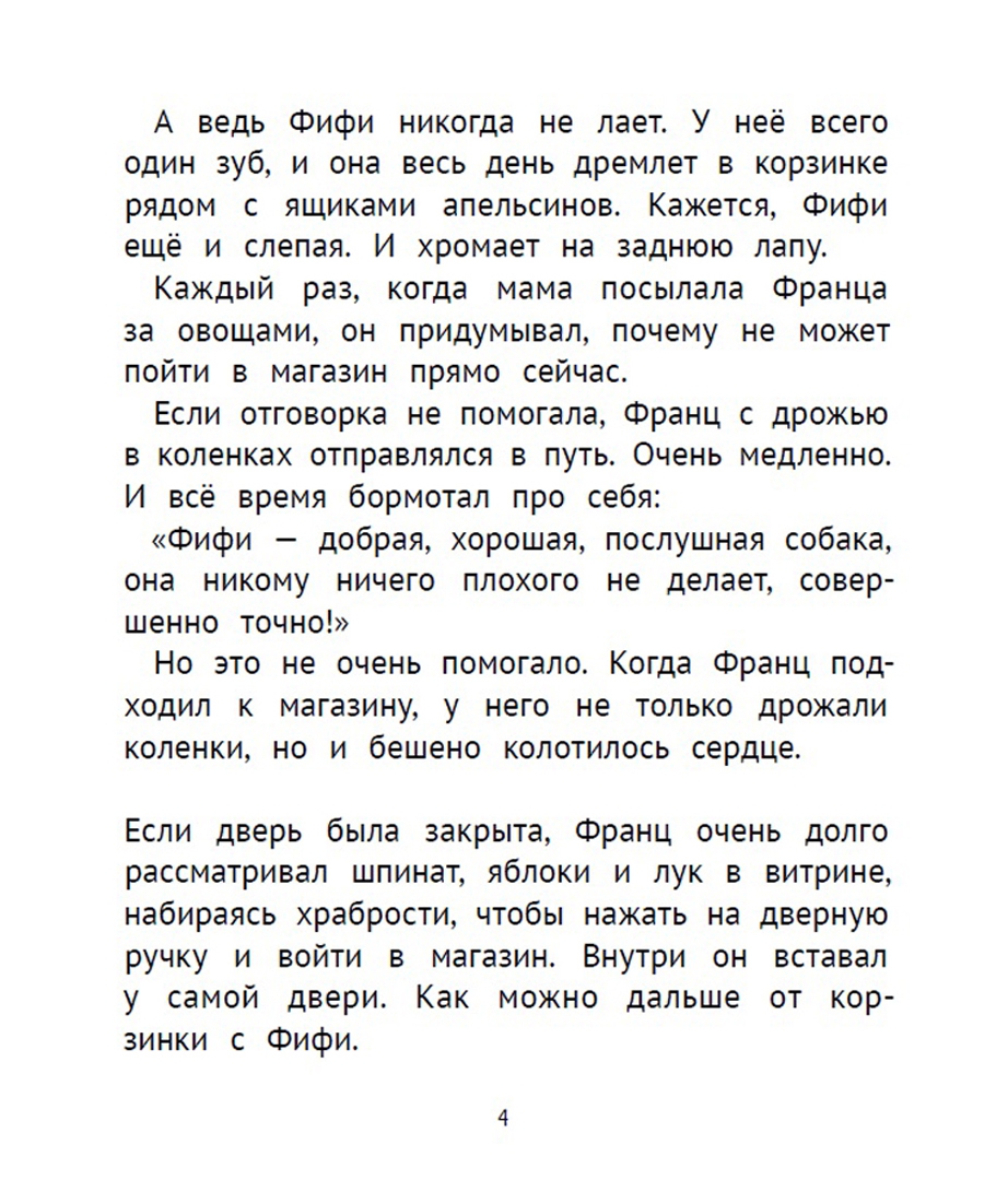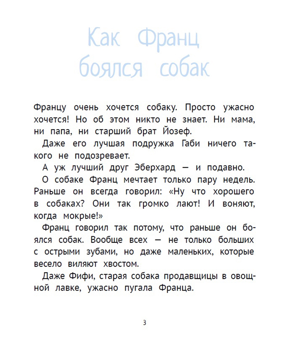 В этой книге классика австрийской детской литературы Кристине Нёстлингер вас ждёт новая порция рассказов про Франца, которому восемь лет. У Франца есть тайна: он очень-очень боится собак. Любых – больших и маленьких, старых и совсем ещё щенков. Франц так этого стесняется, что никому о своём страхе не рассказывает, даже маме с папой. Он ведь и так маленького роста, голос у него писклявый, а ещё многие говорят, что он похож на девочку… Нет уж, пусть мама с папой лучше не знают, какой он трус. Франц и в страшном сне представить не может, как это – гладить собаку, гулять с ней, играть, дружить… И разве может когда-нибудь случиться так, что больше всего на свете он захочет завести собаку? Да ни за что!