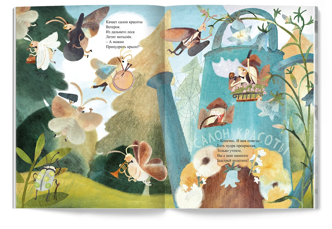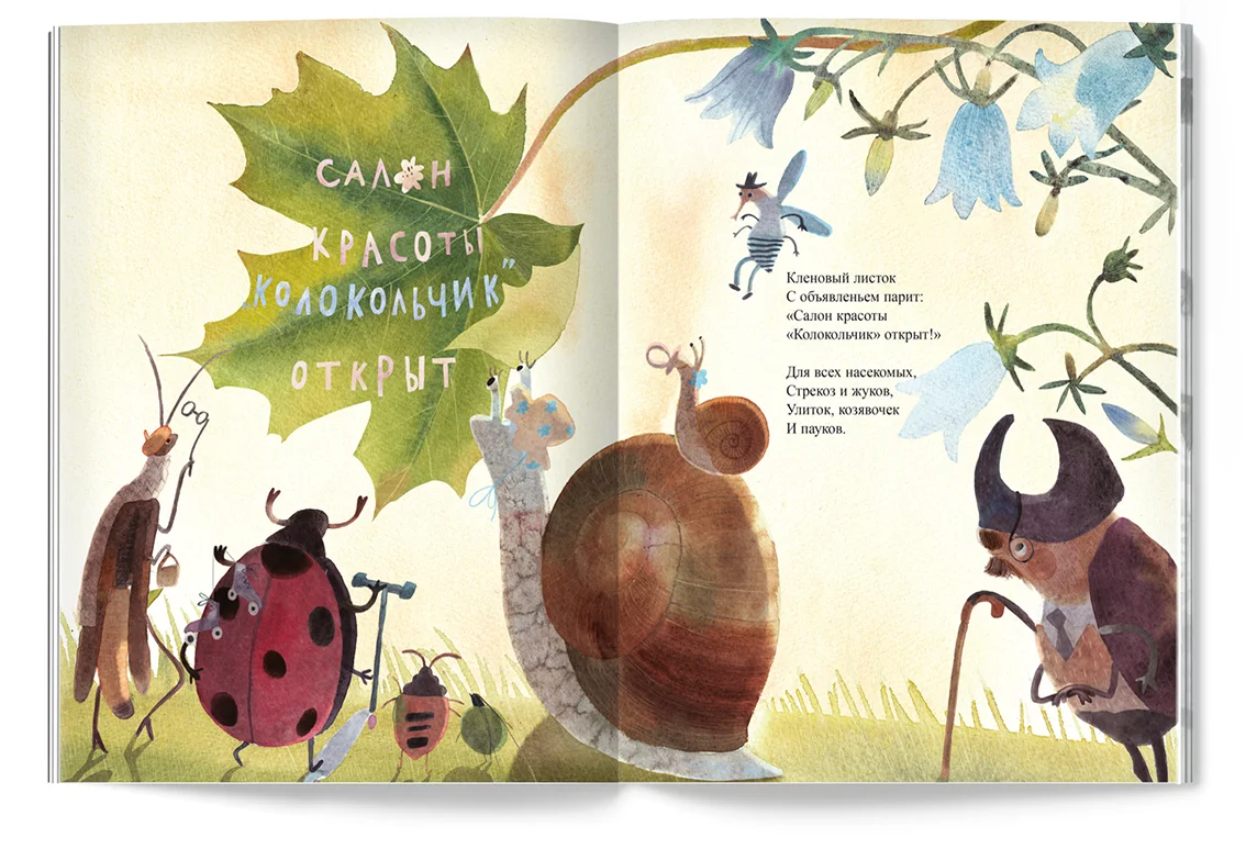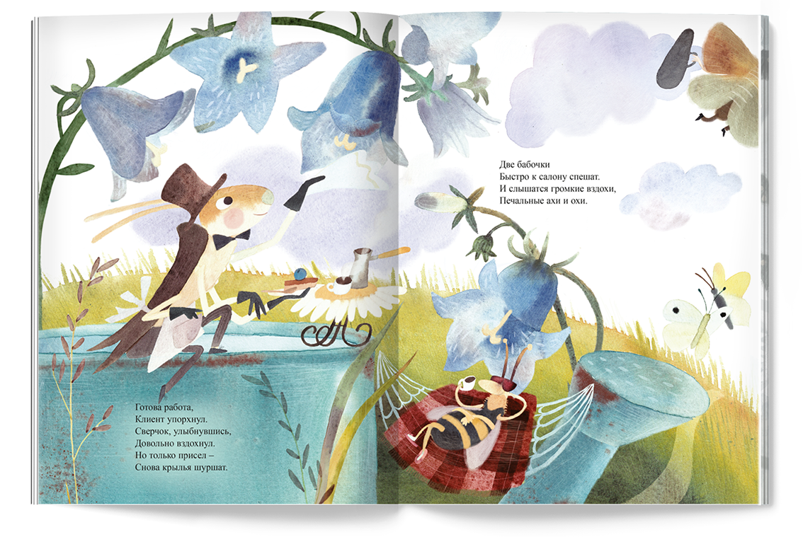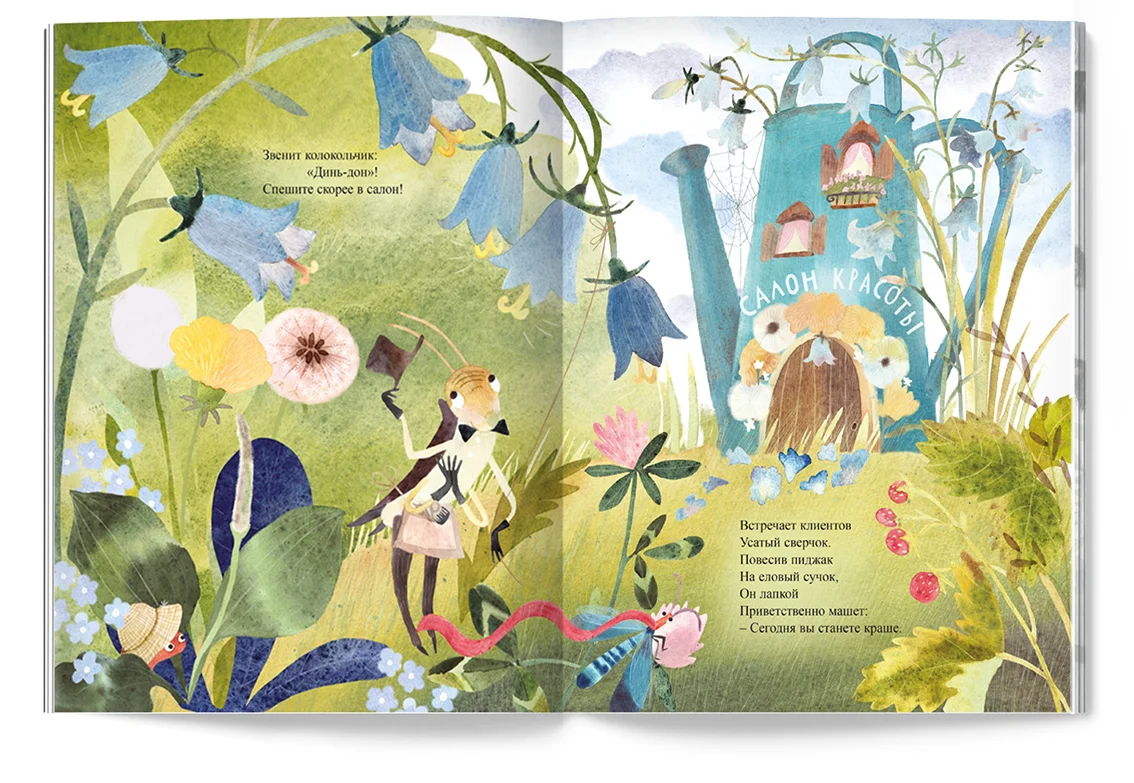 Весь день напролёт усатый сверчок наводит лоск бабочкам, стрекозам и жукам в салоне красоты «Колокольчик».