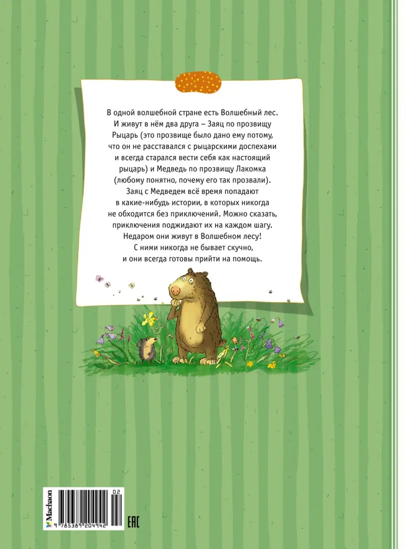 В одной волшебной стране есть Волшебный лес. И живут в нём два друга – Заяц по прозвищу Рыцарь (это прозвище было дано ему потому, что он не расставался с рыцарскими доспехами и всегда старался вести себя как настоящий рыцарь) и Медведь по прозвищу Лакомка (любому понятно, почему его так прозвали). Заяц с Медведем всё время попадают в какие-нибудь истории, в которых никогда не обходится без приключений. Можно сказать, приключения поджидают их на каждом шагу. Недаром они живут в Волшебном лесу! С ними никогда не бывает скучно, и они всегда готовы прийти на помощь.