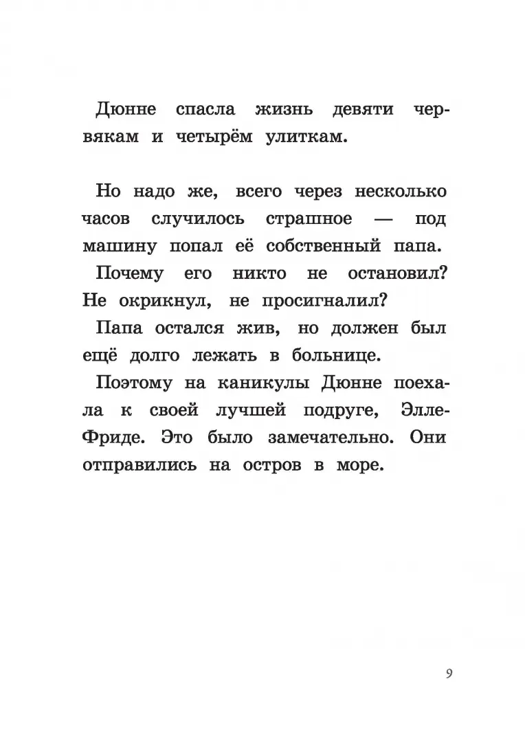 Долгожданные летние каникулы Дюнне – той самой, что живет на Хумлевеген и закончила первый класс – предстоит провести в гостях у лучшей подруги Эллы-Фриды в большом доме на острове. Лето проходит замечательно: девочки купаются по пять-шесть раз в день, играют и веселятся, а ещё – подрабатывают. Каждое утро подружки торопятся на пристань, куда ровно в 9:10 причаливает катер, и пассажиры с удовольствием покупают свежие булочки, кофе и сок. Успеть всё продать за несколько минут, пока катер не двинется дальше – очень азартно! А вечерами Дюнне болтает по телефону с папой. “Я счастлива, и пусть так будет всегда!” – думает девочка. Всё так и есть, пока однажды кузен Эллы-Фриды не раскрывает секрет… К такому повороту событий Дюнне была совсем не готова!
